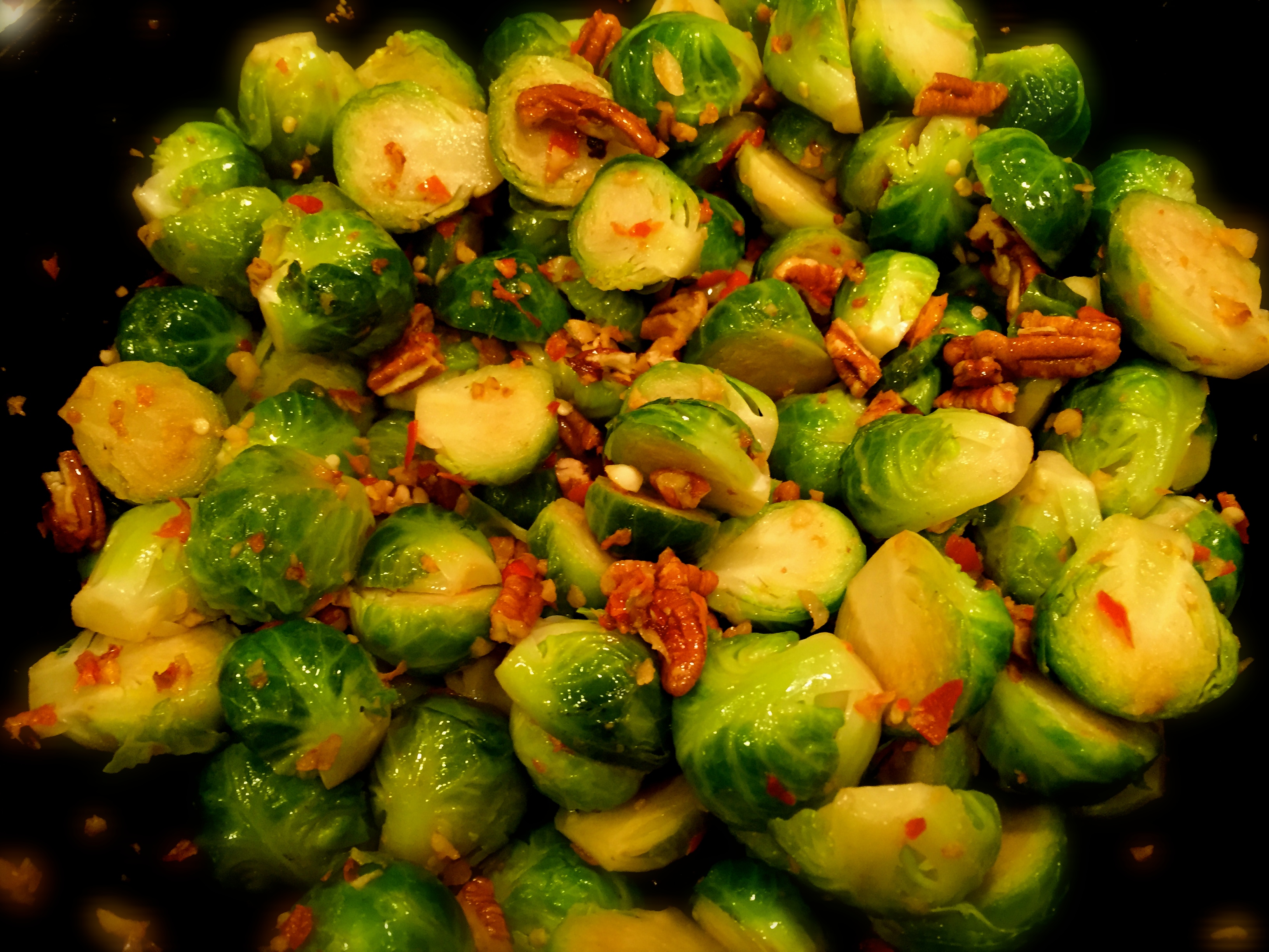 The trick to making this recipe work, is to not overcook them. Be sure you get really fresh and firm sprouts, which are bright green. When you steam/cook them in the pot, add only a little water which will evaporate in a few minutes. Keep a close eye on them. Once you put them into the pan with the garlic, chiles and nuts, sauté them until bright green and crisp-tender. Some blackened spots are fine. Just don’t let them get mushy.