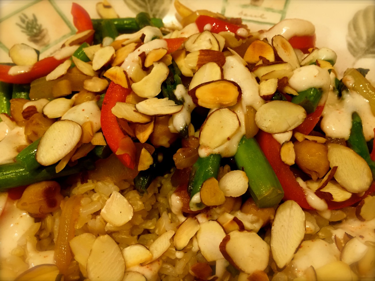 If you start some rice or quinoa ahead of time, this dinner comes together in under 20 minutes. Don’t skip the Tahini Sauce! When you taste the combination of the sauté, sauce and crunchy almonds, you’ll know why! It’s divine!