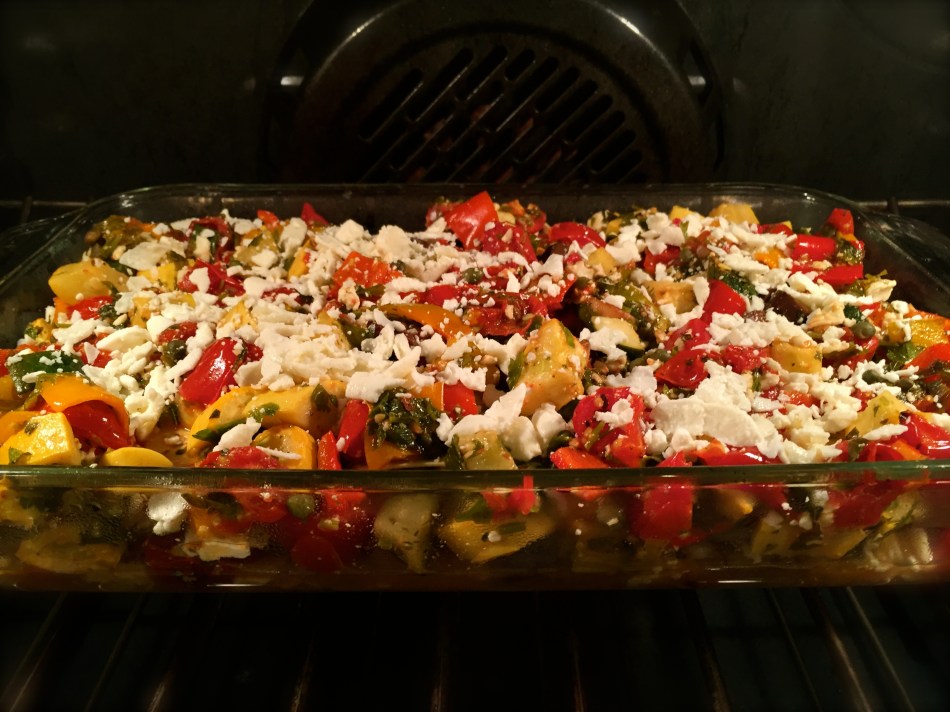 There are a couple of steps to make this dish. First roast the entire squash for about an hour. While the squash is roasting, cut all your vegetables into roughly the same bite size pieces and roast. Once those steps are finished, all you have to do is hollow out the squash and fill it. If you don’t eat cheese, just leave it out. There is plenty of flavor without it from the herbs, roasted garlic cloves, capers and olives. I made the same roasted vegetable dish and turned it into a lasagne, using “no boil” pasta. Delicious either way!