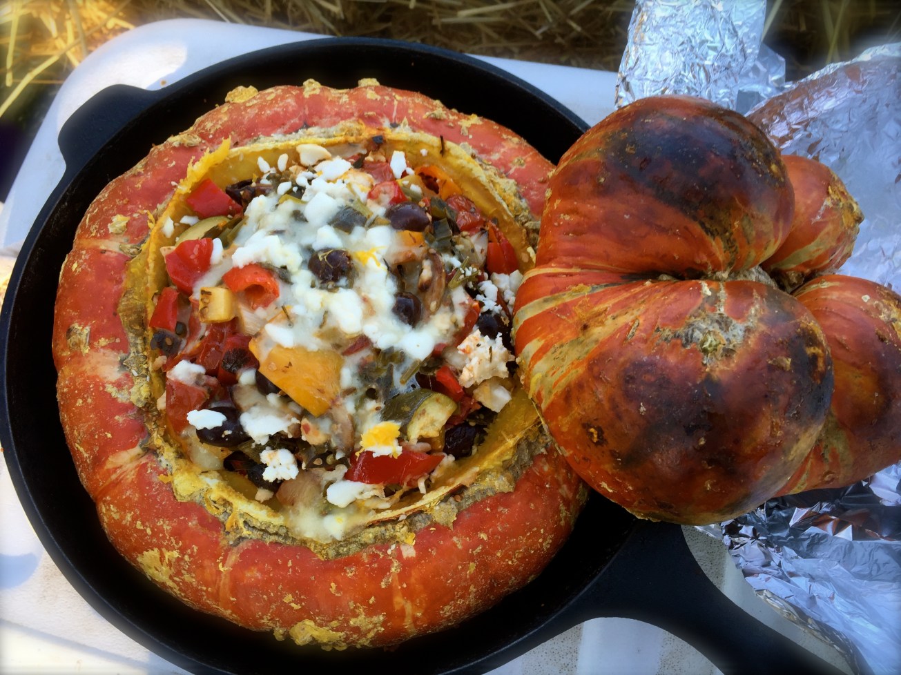 Suddenly, it hit me: I could make my roasted “greek-style” ratatouille, and stuff this winter squash with those veggies!