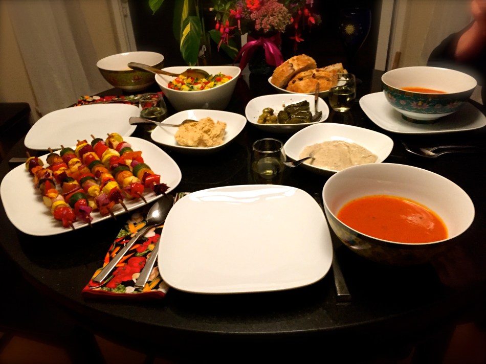 When a friend recently came over for dinner, I wanted to prepare a Mediterranean themed dinner to go with a bottle of Retsina I had picked up at the store. Along with this wine ( one of my very favorite ones! ) I picked up some dolmas, hummus, baba ganoush, and a loaf of preserved lemon and olive bread. I also made a simple tomato soup and a tropical summer salad to complement these dishes.