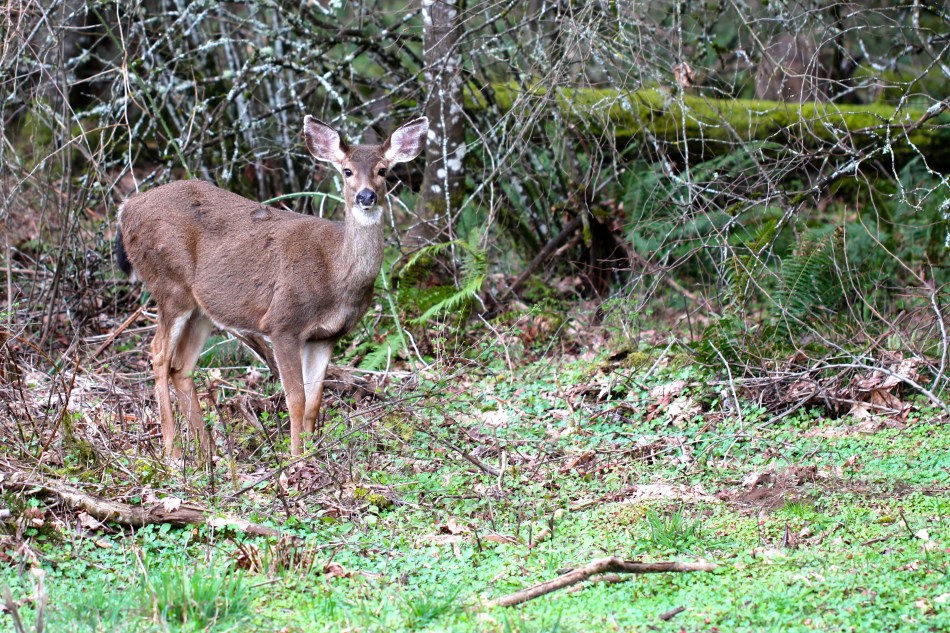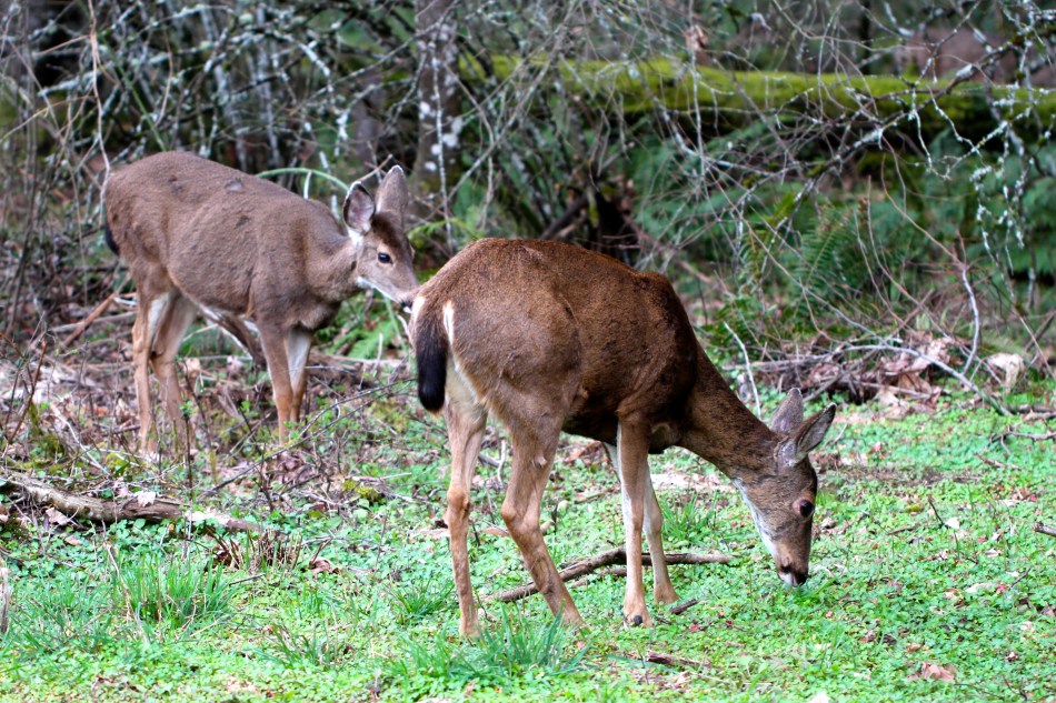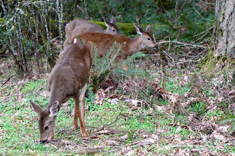 Last night I spotted a deer from the kitchen window. I grabbed my camera and went outside to take a closer look. Once I got to the back fence I discovered that there were actually four black-tailed deer moving slowly through the forest. They were munching on the newly emerging grasses and tree shoots.