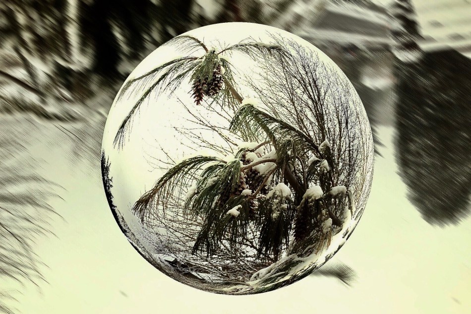 I like the sugar icing comparison! I grew up in the snow, and after living in the snowless parts of California for so long I had forgotten how beautiful snow can be. The last photo I created using an app called “Fisheye Pro”. It was a lot cheaper than a real fisheye lens at $2.99! It has all kinds of cool features I’m experimenting with.