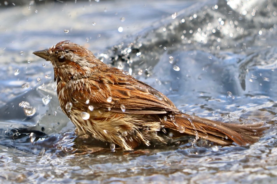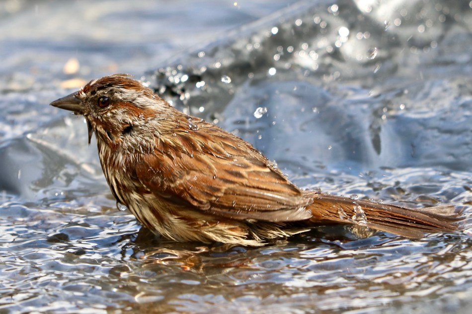 There are several birdbaths in my garden, but this song sparrow took a dip in a puddle that formed on a black plastic tarp. Last spring I covered a large part of a flowerbed with it, in hope of taming some out of control alstroemeria. After some rain, this song sparrow came along and took a leisurely, yet vigorous bath! It must have taken several minutes. After all the feathers were clean, he flew off to continue his preening out of sight in a nearby shrub, but not before taking one last head first dive into the water!