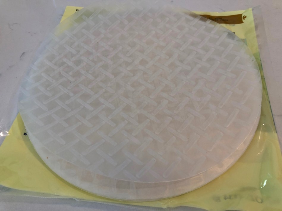 The rice paper is stiff and has a waffle weave texture. When dipped into water, it becomes translucent and pliable. Once wet, it’s kind of delicate. It does tear and gets sticky when soaked too long. Practice is the only way to get the hang of it!