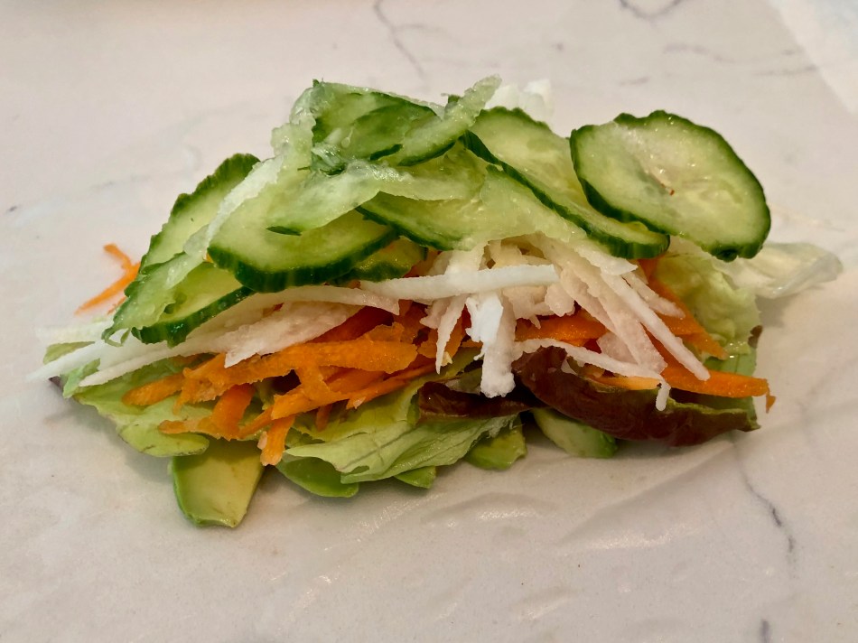 This is a really easy dinner or lunch on a hot day. It’s also fast because it doesn’t take much time to grate a few vegetables and then roll them up in the softened spring roll wrapper. I sautéed some peppered tofu for a side dish.