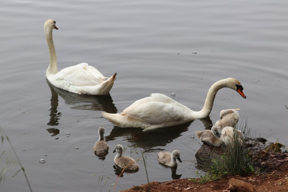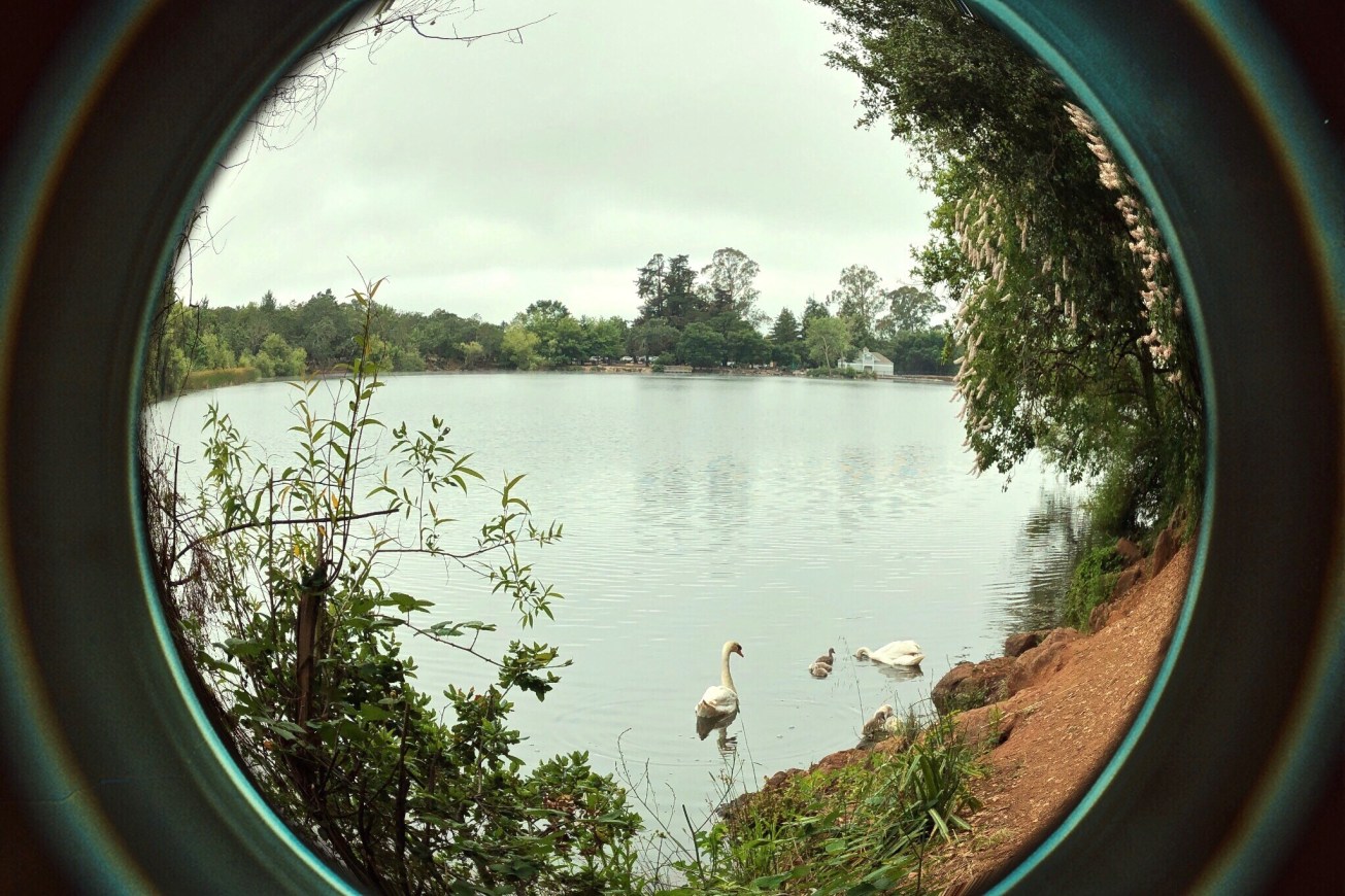 One of my favorite spots to visit in Sonoma County is Howarth Park. it’s located in the southeast part of Santa Rosa, right on Summerfield Road. One of its draws is Lake Ralphine, which is about 22 acres in size. There are several trails around it, some leading through hillsides studded with oak, madrone and manzanita trees. Part of one trail around the lake winds right along the water’s edge. Just a few minutes from where the lakeside trail started, I noticed this beautiful swan couple and their six cygnets calmly swimming and preening themselves. I stopped and almost froze because I didn’t want them to swim off. The parents definitely kept an eye on me, but never hissed or got territorial. So I just stood there and watched for a while.