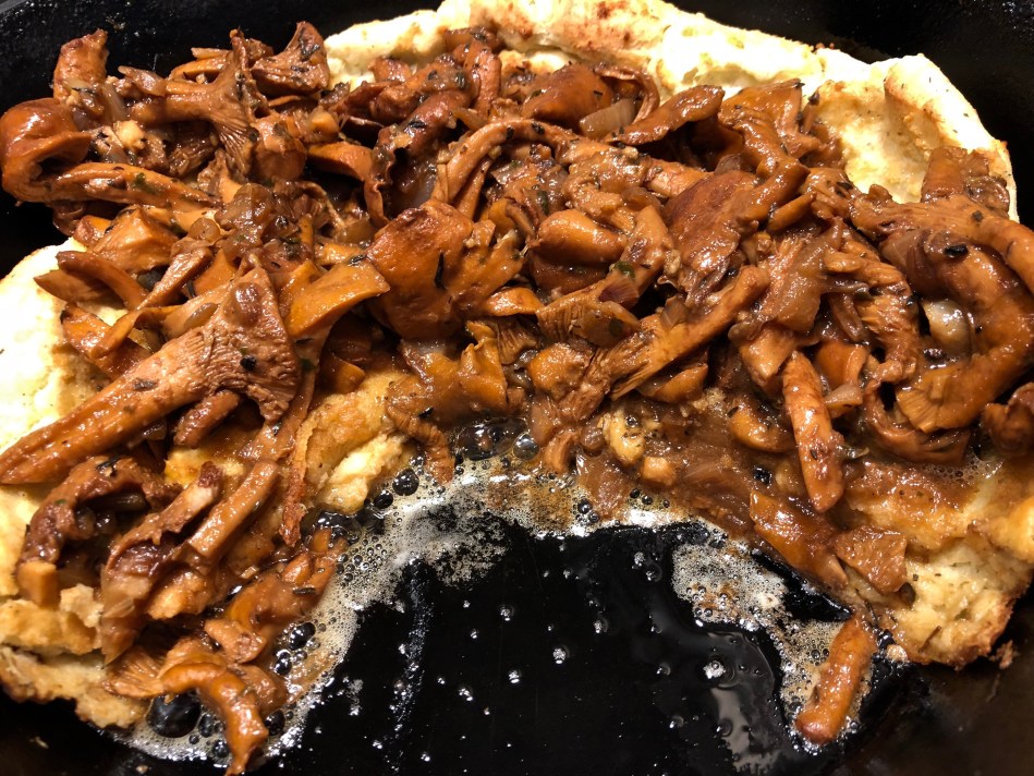 When the Dutch Baby is done, remove it from the oven and top it with the mushrooms.