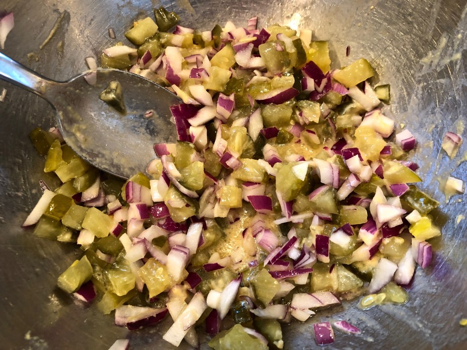 While the potatoes are cooking, ready the vegetables by finely chopping one small red onion and a heaping one half of a cup of pickles. Also add a couple of tablespoons of Dijon mustard and a third of a cup of pickle juice to the bowl.